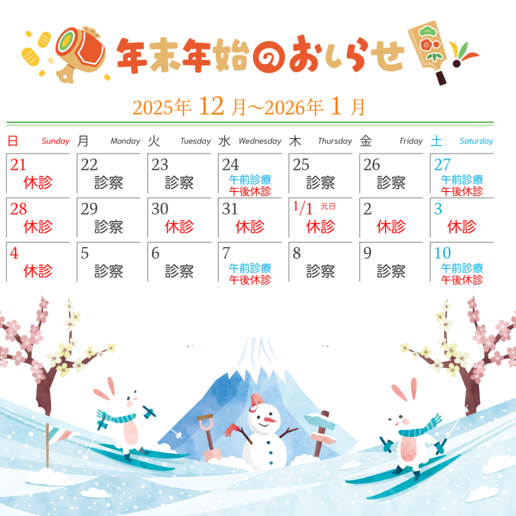 2025年12月30日(火)から2026年1月4日(日)まで年末年始の休診とさせていただきます。